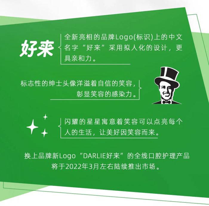 据黑人牙膏微信公众号12月14日消息,DARLIE将启用公司创始中文名字“好来”,代替“黑人”名称。更新后的“DARLIE好来”品牌全线口腔护理产品将于2022年3月左右陆续推出市场。