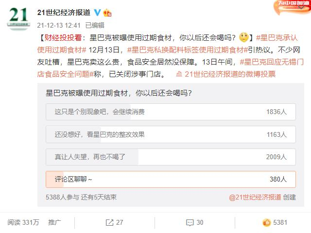21网调实验室针对星巴克“篡改食品日期”事件发布调查,收到超5300名微博网友的反馈。数据显示,近四成投票网友表示对星巴克很失望,称再也不会消费了。另外,有超两成投票网友称是否决定消费,还要看星巴克的整改效果。