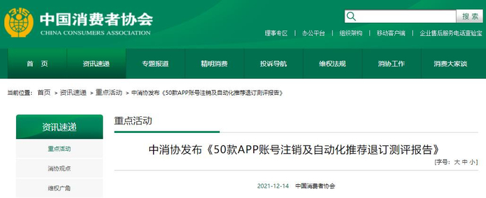 中国经济网北京12月15日讯 12月14日,中国消费者协会发布消息“中消协发布《50款APP账号注销及自动化推荐退订测评报告》”。中国消费者协会近日组织开展了APP账号注销及自动化推荐退订测评工作。