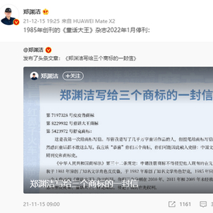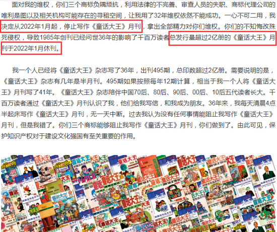 早在11月15日,郑渊洁就在其发布的《郑渊洁写给三个商标的一封信》文章中提到,因32年维权未能成功,“决定从2022年1月起,停止写作《童话大王》月刊”,“总发行量超过2亿册”的《童话大王》月刊于2022年1月休刊”。