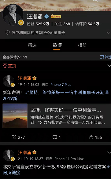 而基金君查看汪潮涌微博,坐拥525万粉丝的他,自10月19日转发北交所消息后,便再无更新。