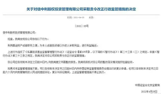 4月25日,北京证监局披露对信中利股权投资管理有限公司采取责令改正行政监管措施的决定。经查,北京证监局发现信中利股权投资管理有限公司存在以下行为:利用基金财产或者职务之便,为本人或者投资者以外的人牟取利益,进行利益输送。上述行为违反了《私募投资基金监督管理暂行办法》(证监会令【第105号】,以下简称《暂行办法》)第二十三条(三)之规定。依据《暂行办法》第三十三条之规定,北京证监局决定对该公司采取责令改正行政监管措施。