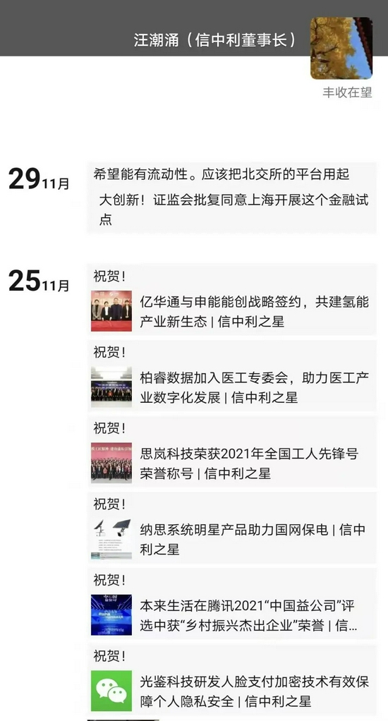 据券商中国,汪潮涌最后一条微信发于11月29日,“希望能有流动性,应该把北交所的平台用起。”整个12月没再更新过。