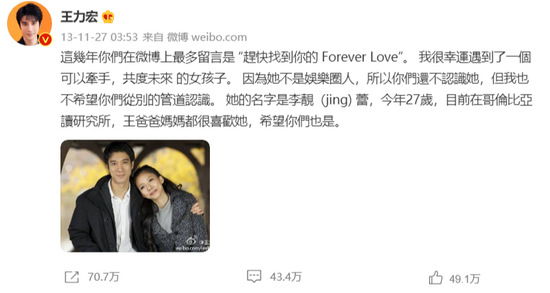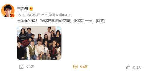 仅仅两天之后,11月29日凌晨,王力宏亲自发微博感谢好友、粉丝及媒体祝福,确认婚讯,并称正在与全家人过感恩节。