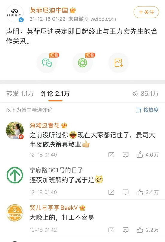 虽然无法确认长文的真实性,但王力宏多年优质偶像形象无疑受到了影响。12月18日凌晨,@英菲尼迪中国 火速发布声明:英菲尼迪决定即日起终止与王力宏先生的合作关系。12月16日,英菲尼迪才官宣王力宏成为品牌代言人。这也意味着,王力宏代言英菲尼迪仅2天,这也被网友戏称为“史上最短代言”。