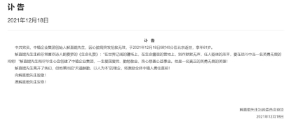 12月18日晚间,据中植企业集团微信公号消息,中共党员、中植企业集团创始人解直锟先生,因心脏病突发抢救无效,于2021年12月18日9时40分在北京逝世,享年61岁。