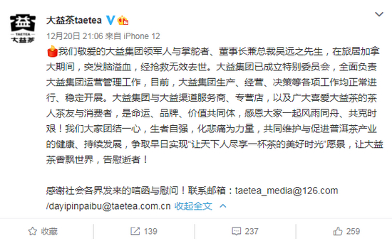 12月20日晚间,云南大益茶业集团有限公司在其官方微博发布消息,确认集团董事长兼总裁吴远之突然去世这一消息。