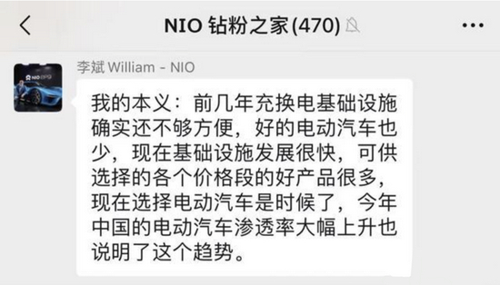 对此,李斌在蔚来用户群中作出回应。其表示,“前几年充换电基础设施确实还不够方便,好的电动汽车也少,现在基础设施发展很快,可供选择的各个价格段的好产品很多,现在选择电动汽车是时候了,今年中国的电动汽车渗透率大幅上升也说明了这个趋势。”