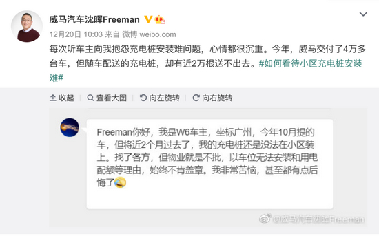 充电桩是电车使用中不可或缺的一部分,相当于加油站。与加油站不同的是,当前公共充电桩的数量在快速增长,但是充电桩的建设速度却远远跟不上电车销售的速度,而且还存在充电车位被油车占用、设备兼容问题导致无法充电的问题,充电成为困扰很多电车车主的难题。当然,你可能会提到私人充电桩,有些新能源汽车公司推出买车就送充电桩,但是实际上因为种种原因,例如小区限电、车位有限等,安装充电桩也是一大难题。近日,新势力公司威马汽车董事长沈晖就在微博上公开表达了此情况。