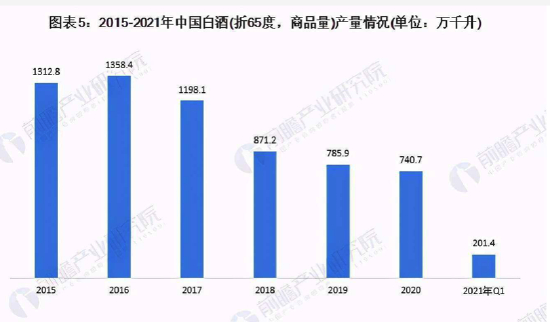 据国家统计局,2015年至今全国白酒产量从2015年的1313万吨,到2016年小幅上升到1358万吨,触达行业峰值后,便一直持续下降。2020年,全国白酒产量已经下滑至786万吨,几乎只是五年前的一半。