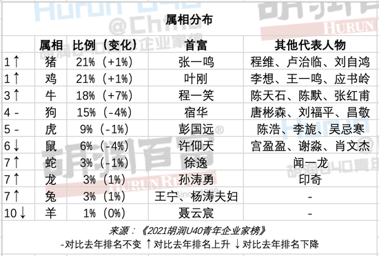 U40青年企业家属猪和属鸡的最多,排名第一第二的张一鸣和叶刚分别属猪和属鸡。牛第三。属马、属猴的一位都没有。