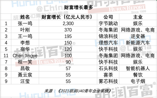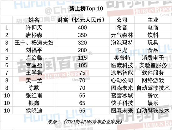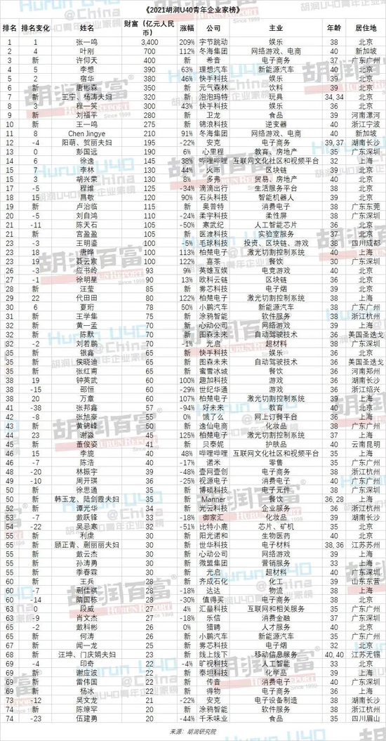 2021胡润U40青年企业家榜发布,75人入榜