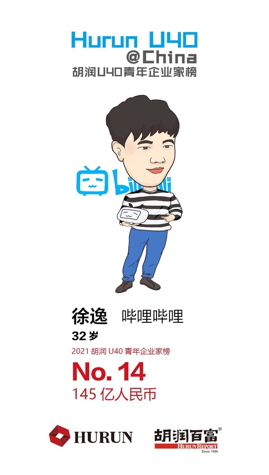 徐逸 哔哩哔哩32岁的徐逸以145亿财富位列第14位。成立于2009年的哔哩哔哩是中国年轻世代高度聚集的文化社区和视频平台,于今年3月登陆港交所,成功完成继2018年纳斯达克上市后的二次上市。目前市值1,900亿元。哔哩哔哩位列《2021嘉兴·胡润世界500强》第425名。徐逸曾入围2018、2019两年的胡润U30中国创业领袖榜。
