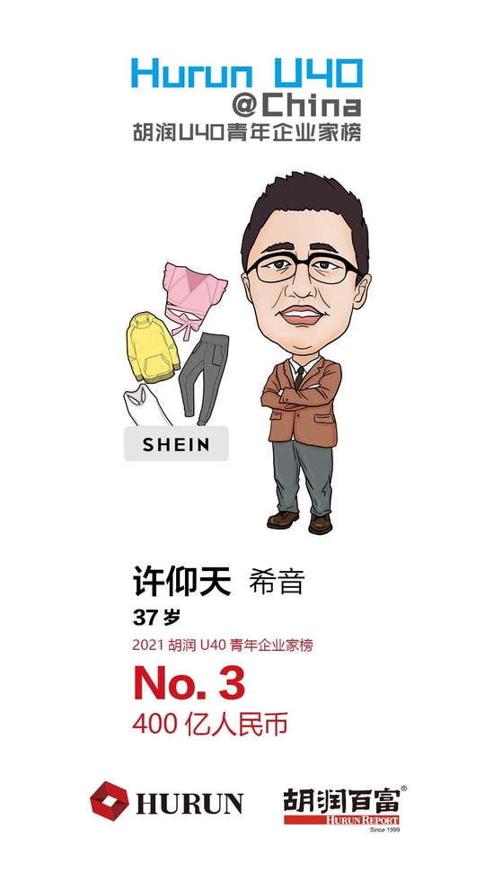 许仰天 住广州的希音37岁许仰天,这位低调的“黑马”,以400亿财富首次上榜,位列第三。2008年成立的希音凭借供应链生态,搭建独立平台将中国设计制造的自有品牌服装销往欧美市场,现已成为全球知名跨境电商。瞄准后疫情时代的机遇,希音与海外年轻用户紧密连接,不断扩充品类。在刚刚发布的《2021全球独角兽榜》上,希音以1,300亿元估值位列第16名。