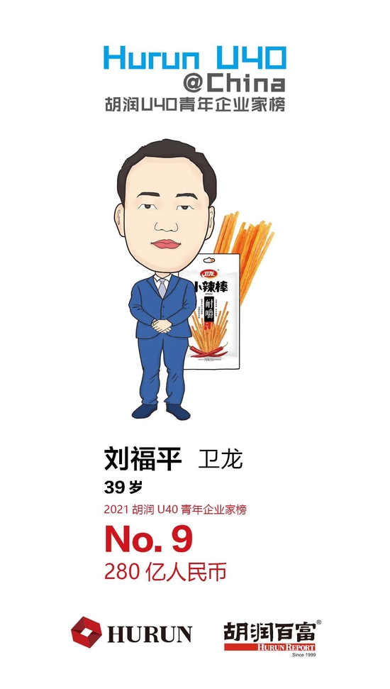 刘福平 卫龙食品39岁的刘福平以280亿财富首次上榜,位列第九。成立于1999年的卫龙食品已经成为中国最大的辣味休闲食品企业。目前卫龙的估值已达到600亿元,最近首次登上《2021全球独角兽榜》,位列第49名。