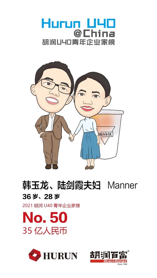韩玉龙、陆剑霞夫妇 Manner 36岁的韩玉龙和28岁的陆剑霞夫妇以35亿财富首次上榜,位列第50位。成立于2015年的Manner咖啡连琐品牌从上海开始进行全国扩张。目前估值180亿元,最近首次登上《2021全球独角兽榜》,位列第282名。