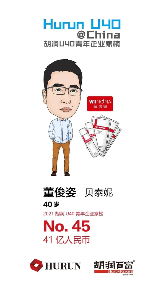 董俊姿 贝泰妮40岁的董俊姿以41亿财富首次上榜,位列第45位。成立于2010年的贝泰妮以旗下品牌“薇诺娜”为核心,致力于打造温和专业的皮肤护理产品。贝泰妮于今年3月成功登陆深交所,目前市值800亿元。
