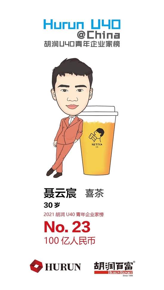 聂云宸 喜茶30岁的聂云宸以100亿财富位列第23位,成为最年轻的百亿级企业家。成立于2012年的喜茶已发展成为中国新式茶饮连琐品牌,通过积极推动数字化建设并打造丰富的消费场景,备受年轻人的青睐。目前估值400亿元,在刚刚发布的《2021全球独角兽榜》上,喜茶位列第88名。聂云宸曾入围2017胡润U30中国创业领袖榜。
