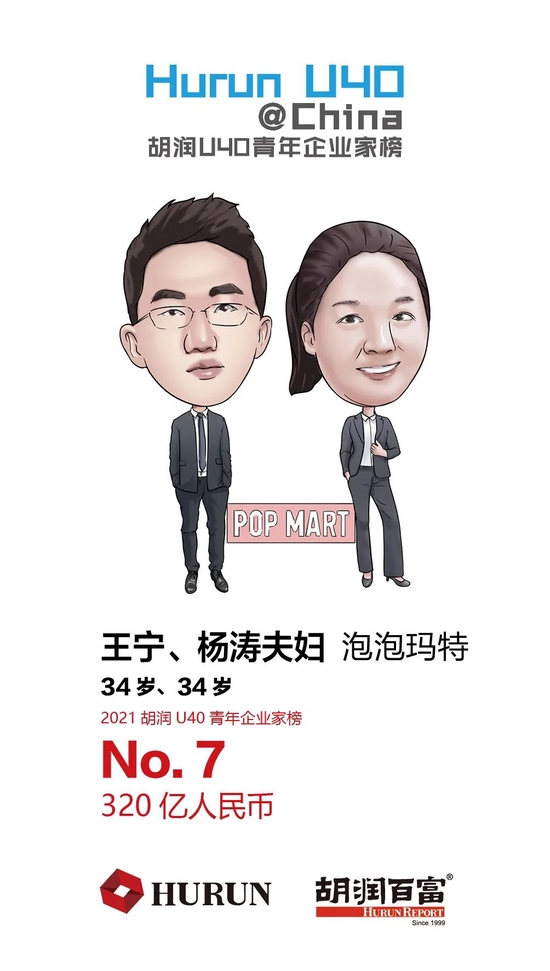 王宁、杨涛夫妇 泡泡玛特34岁的王宁、杨涛夫妇以320亿财富首次上榜,位列第七。成立于2010的泡泡玛特现已发展成为中国领先的潮流文化娱乐公司,并于去年12月登陆港交所,目前市值700亿元。