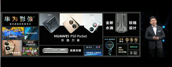 华为此次发布的新款折叠屏手机,也是华为首款纵向折叠手机,叫华为 P50 Pocket。从名称也可以看出,这是一款可以置入口袋的手机,折叠之后外形非常的小巧,也叫做“华为P50 宝盒”。值得注意的是,这仍是一款4G手机,采用骁龙888 4G平台。