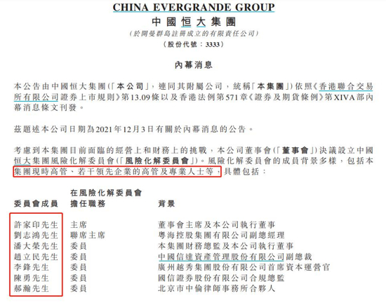 12月6日,中国恒大在港交所公告称,考虑到集团目前面临的经营上和财务上的挑战,公司董事会决议设立中国恒大集团风险化解委员会。风险化解委员会的成员背景多样,包括集团现任高管、若干领先企业的高管及专业人士等,具体包括:许家印、刘志鸿、潘大荣、赵立民、李锋、陈勇、郝瀚。