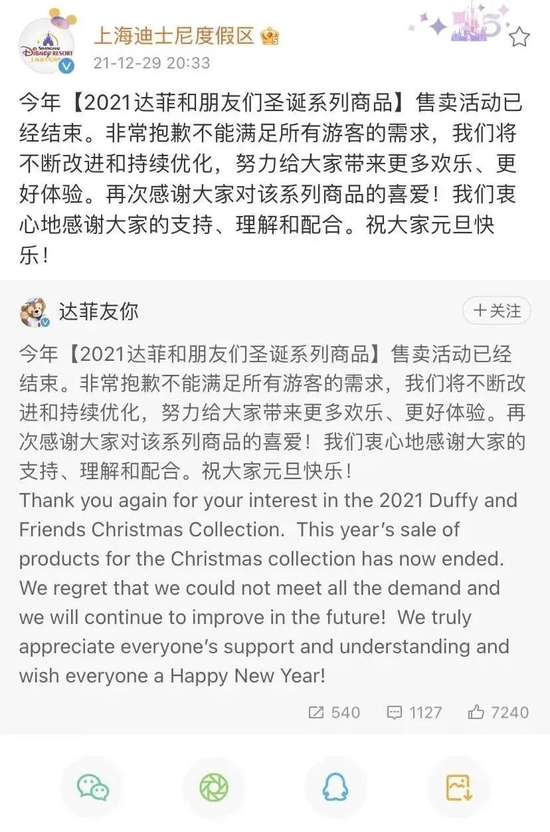 今年【2021达菲和朋友们圣诞系列商品】售卖活动已经结束。非常抱歉不能满足所有游客的需求,我们将不断改进和持续优化,努力给大家带来更多欢乐、更好体验。再次感谢大家对该系列商品的喜爱!我们衷心地感谢大家的支持、理解和配合。祝大家元旦快乐!