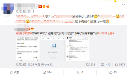 23日,该事件在微博上热度渐起。有网友发博称:“英特尔致歉了,但是网友发现山姆超市下架了所有新疆产品。”