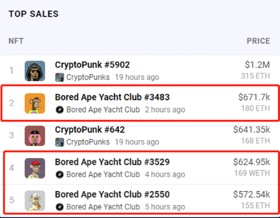截至2022年1月1日,库里买过的无聊猿NFT项目(Bored Ape Yacht Club)的价值也迅速攀升,在DappRadar平台,24小时内售价前五名中无聊猿NFT占据三位,三款平均售价约为62万美元。
