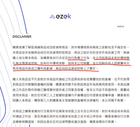 在周杰伦加持NFT项目的官网免责声明里,Ezek也表示,本商品并非金融商品或任何投资理财型商品,商品之设计目的并非作为投资之用,无论购入或出售本商品,为购买者自行决定且自行负责之行为,本公司就商品未来的价格变化无法预测或控制,如有任何价格波动,皆与本公司无关。