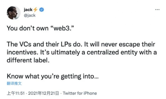 Jack Dorsey首先表示,你并不拥有‘web3’,风险投资公司和他们的有限合伙人们才是拥有者,它永远不会逃脱激励机制,最终,Web3会成为一个有着不同标签的集中化机构。