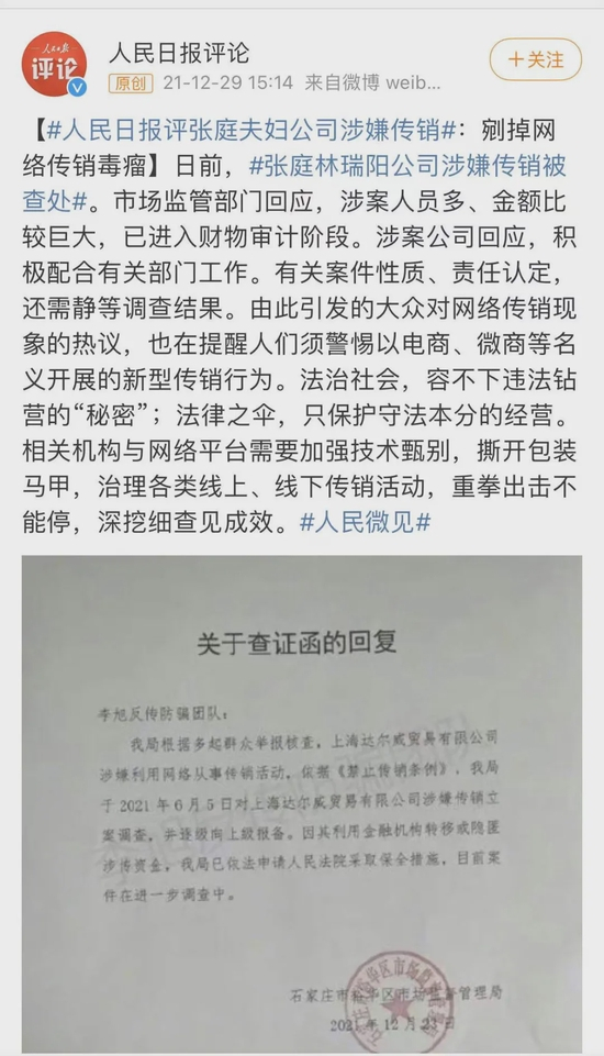 人民日报则对此发文称:日前,张庭林瑞阳公司涉嫌传销被查处。市场监管部门回应,涉案人员多、金额比较巨大,已进入财物审计阶段。涉案公司回应,积极配合有关部门工作。有关案件性质、责任认定,还需静等调查结果。由此引发的大众对网络传销现象的热议,也在提醒人们须警惕以电商、微商等名义开展的新型传销行为。法治社会,容不下违法钻营的“秘密”;法律之伞,只保护守法本分的经营。相关机构与网络平台需要加强技术甄别,撕开包装马甲,治理各类线上、线下传销活动,重拳出击不能停,深挖细查见成效。