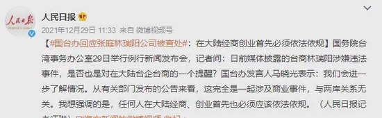12月29日,有记者在国台办例行新闻发布会上提问:日前媒体披露的台商林瑞阳涉嫌违法事件,是否也是对在大陆台企台商的一个提醒?