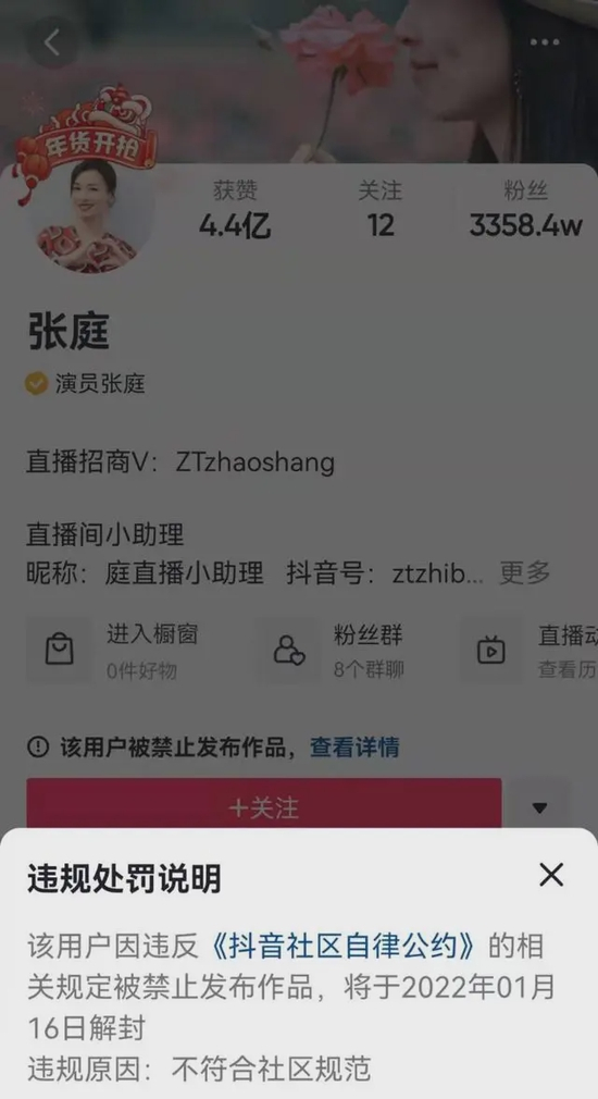 2022年1月2日下午,有细心网友发现,张庭的抖音账号被禁止发布作品,违规原因显示“不符合社区规范”,将于2022年1月16日解封。最新数据显示,张庭抖音账号粉丝超3358万,而TST庭秘密官方抖音号粉丝超过214万。