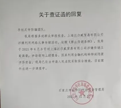 12月24日,反传销机构“李旭反传防骗团队”在微信公众号发文称,团队收到石家庄市裕华区市场监督管理局(以下简称“裕华区市监局”)查证函的回复。裕华区市监局表示,根据多起群众举报核查,达尔威涉嫌利用网络从事传销活动,因其利用金融机构转移或隐匿涉传资金,已经申请人民法院保全措施,目前案件在进一步调查中。
