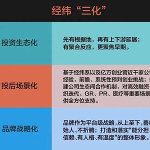 创业者画像的改变,也让他们把本已做得很重的投后服务推向2.0时代。这种急转情境下的应对方式,被张颖概括成了一个颇具传播性的词组:三化策略。具体而言是:投资生态化、投后场景化和品牌战略化。