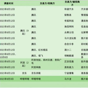 11月20日,国家反垄断局成立后的第三天,公布了43起互联网领域未依法申报经营者集中案的行政处罚,其中13起涉及阿里、13起涉及腾讯,百度、京东、美团、58集团各3起,苏宁易购、滴滴各2起,字节跳动、新浪、百世各1起(部分有交叉)。