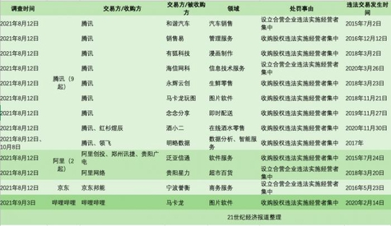 21世纪经济报道记者梳理发现,2021年互联网领域共有85件违法实施经营者集中被处罚案例。
