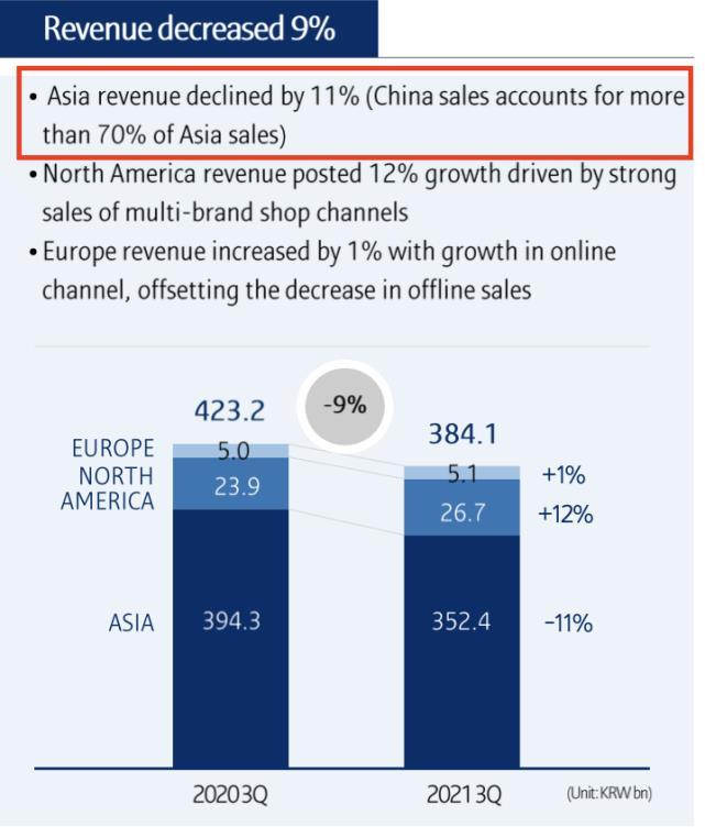而海外业务也是爱茉莉的重要营收来源之一。据其2021年第三季度财报,海外营收为3841亿韩元,占该季度总营收的34.63%。值得注意的是,亚洲地区在其中占比高达91.74%,而中国市场则贡献了其中超70%的的销售额。