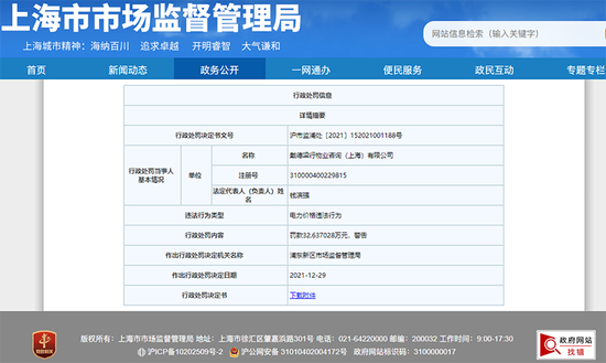 中国网财经1月10日讯(记者 钟文鑫)据上海市市场监督管理局网站消息,近日,戴德梁行物业咨询(上海)有限公司因存在加价收取电费行为,违反了《中华人民共和国电力法》相关规定,构成电力价格违法行为,被上海市浦东新区市场监督管理局罚款32.637028万元。