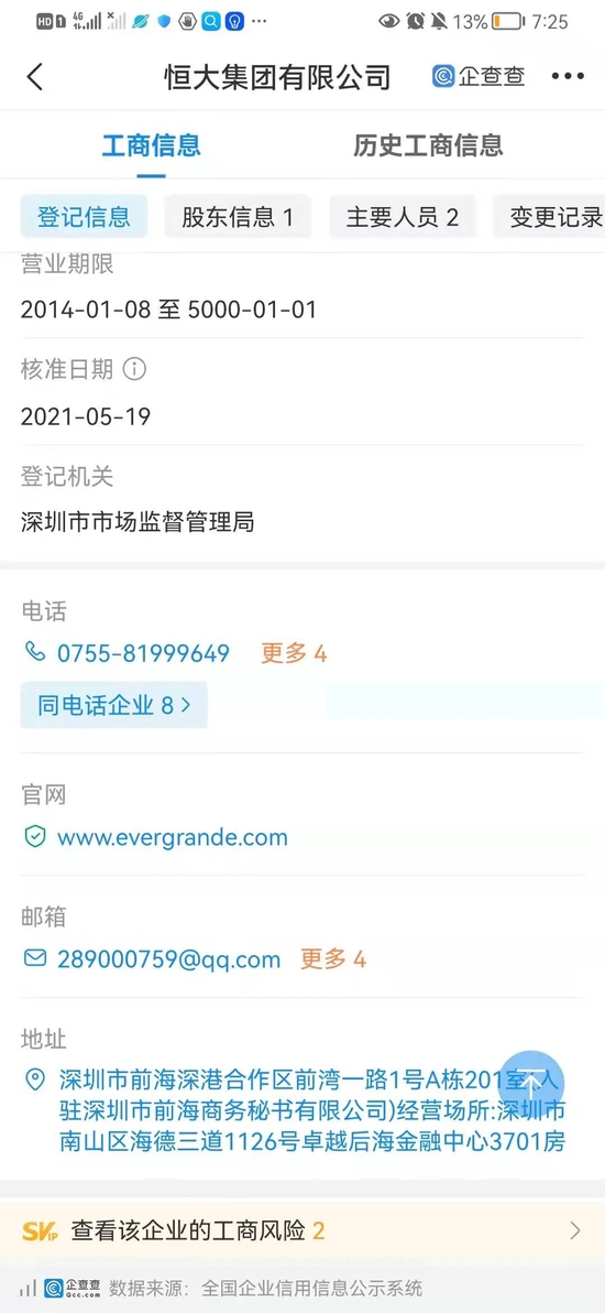 企查查数据显示,目前恒大集团的注册地址仍在深圳。