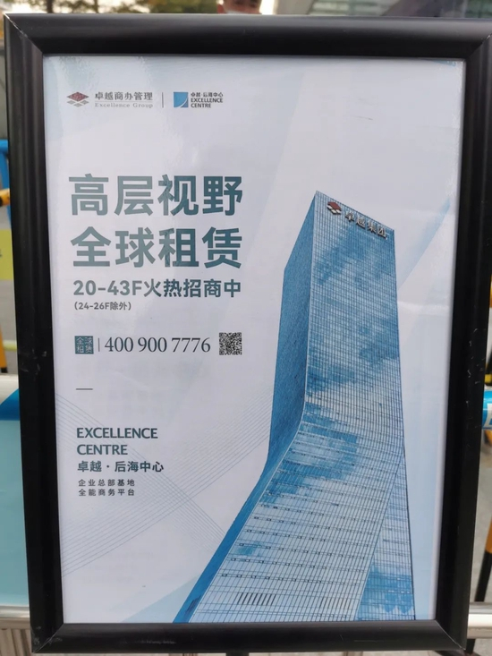 卓越后海中心位于深圳市南山区,是一栋超甲级纯租赁写字楼,由卓越集团开发。目前,卓越后海中心官网及写字楼下,已经挂出了最新的招租广告。记者咨询后得知,写字楼高区月租金大约在250-400元/平方米,每层2000平方米。若以300元的价格粗略估算,每层月租金达60万元,租下十层楼每年需要付约7200万元的租金。
