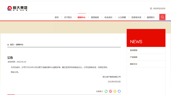 对此,恒大集团发布公告称,为节约成本,公司于2021年12月办理了卓越后海中心退租手续,搬迁至深圳自有物业办公。公司注册地未变,仍然在深圳。
