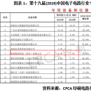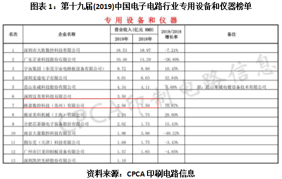 最终只能在2018年和2019年中国PCB专用设备和仪器企业15强排行榜名单中找到维嘉数控科技(苏州)有限公司(即“维嘉有限”,于2020年10月变更为维嘉科技)。