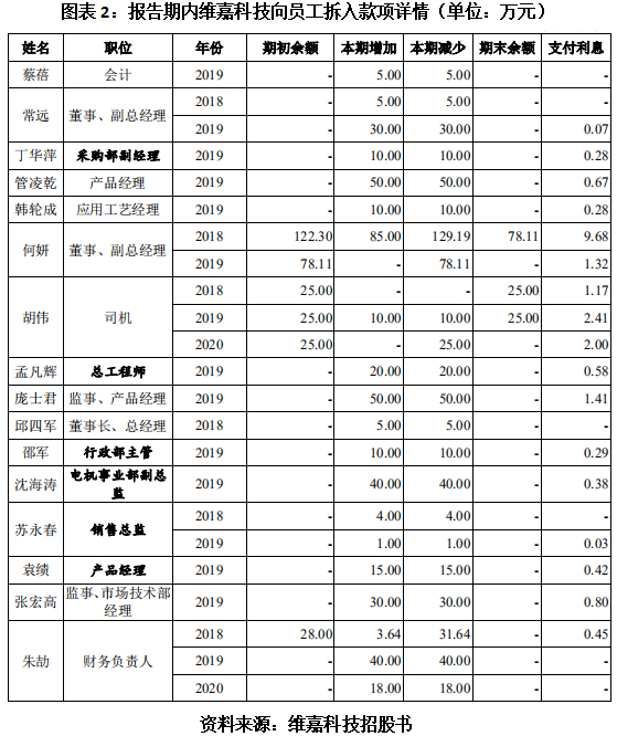 招股书显示,2018—2020年间,维嘉科技向16名员工累计借款441.64万元,这16名员工所在职位上到董事长、总工程师、销售总监、财务负责人,下到会计、司机、产品经理等。