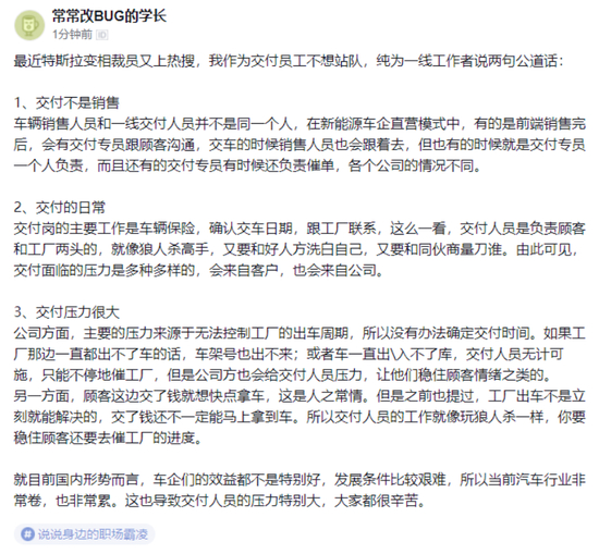 交付顾问要做什么?通俗来说,就是处理客户签约后到交车阶段的相关工作,包括保险、出厂排期、物流、客户沟通等。有网友在脉脉上留言解释称,交付岗“负责顾客和工厂两头”,压力很大。