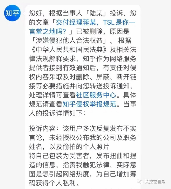 不仅如此,除了知乎的文章被举报,Leila在微博、微信公众号、脉脉的发文,都先后被举报,理由是“侵犯名誉权”。