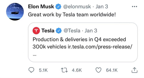 今年1月3日,马斯克在社交网站上转发了特斯拉2021年第四季度数据,“全球特斯拉团队做得非常好!”