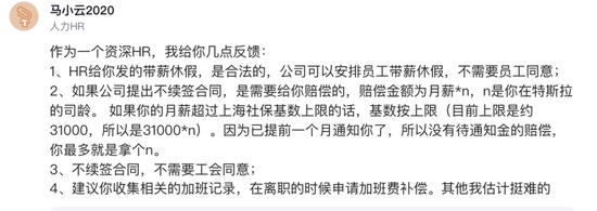 脉脉上也有HR留言称,公司提出带薪休假是合法的,“公司可以安排员工带薪休假,不需要员工同意”。并且,如果公司提出不续签合同,不需要工会同意,只要给够赔偿。