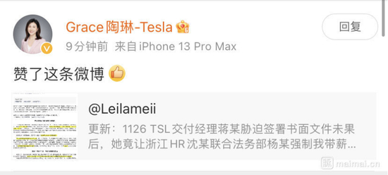 和内部的沟通陷入僵局,Leila在知乎、微博、微信公众号、脉脉上发文维权。Leila在微博上的文章,甚至被特斯拉全球副总裁陶琳“手滑”点赞。