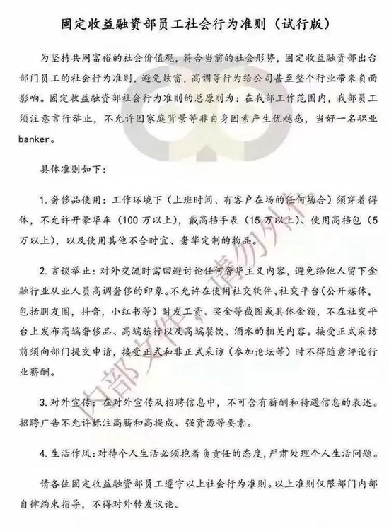 “工作环境下不允许开豪华车(100万以上)、戴高档手表(15万以上)、使用高档包(5万以上)”……1月13日,一则券商《固定收益融资部员工社会行为准则(试行版)》在业内激起不小水花。